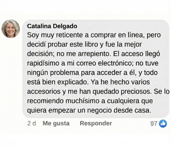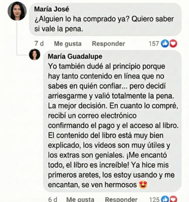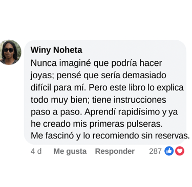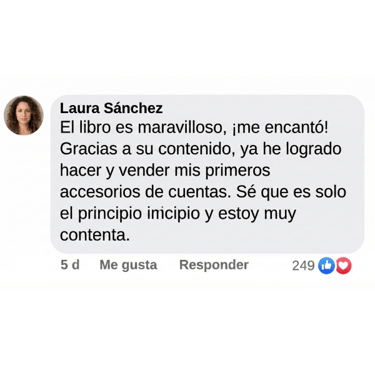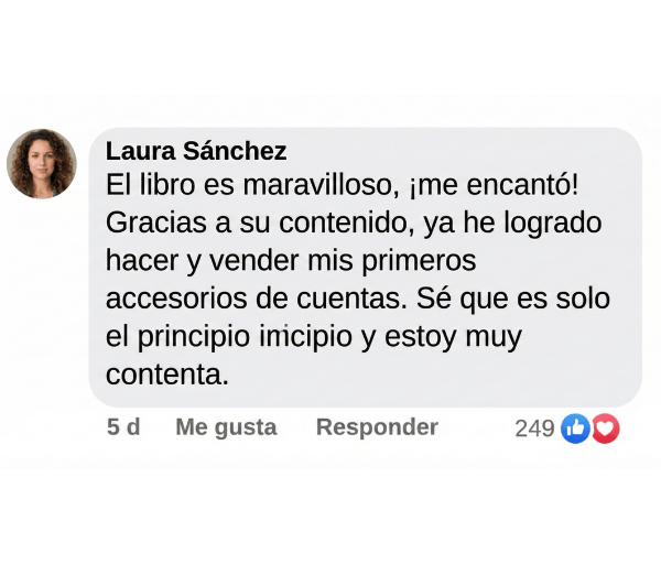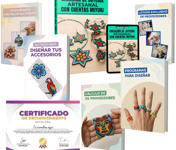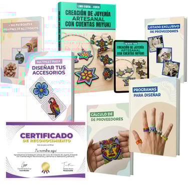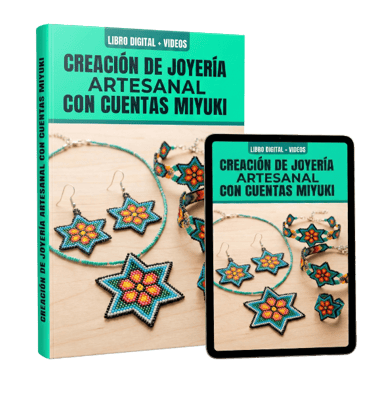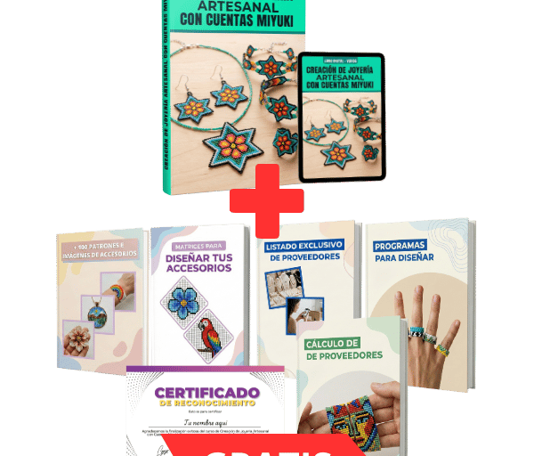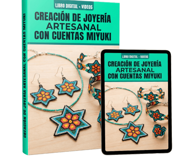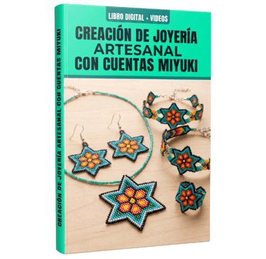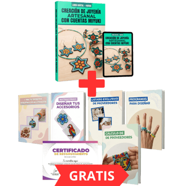 Recibirás el ebook completo con las 4 técnicas de joyería artesanal (peyote par, peyote impar, puntada cuadrada y puntada ladrillo), videos explicativos y 6 bonos adicionales, incluyendo patrones, plantillas, programas de diseño, lista de proveedores, y más.